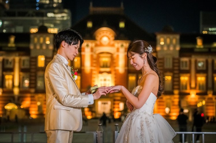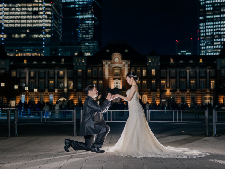 ウェディングアベニューの東京駅パーフェクトプラン~ナイトタイム~です。東京駅で夜の雰囲気で撮影されたい方はこちらのプランがお勧めです。イルミネーションの冬の時期もこちらのプランがお勧めです。