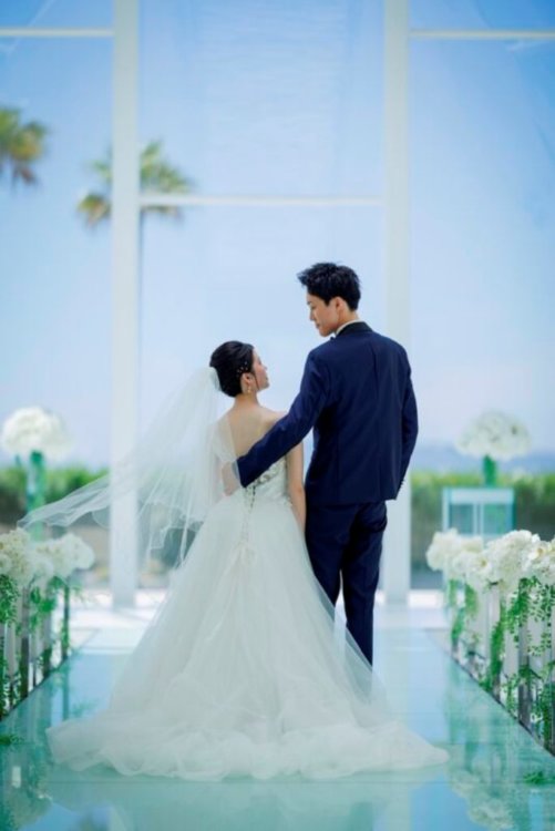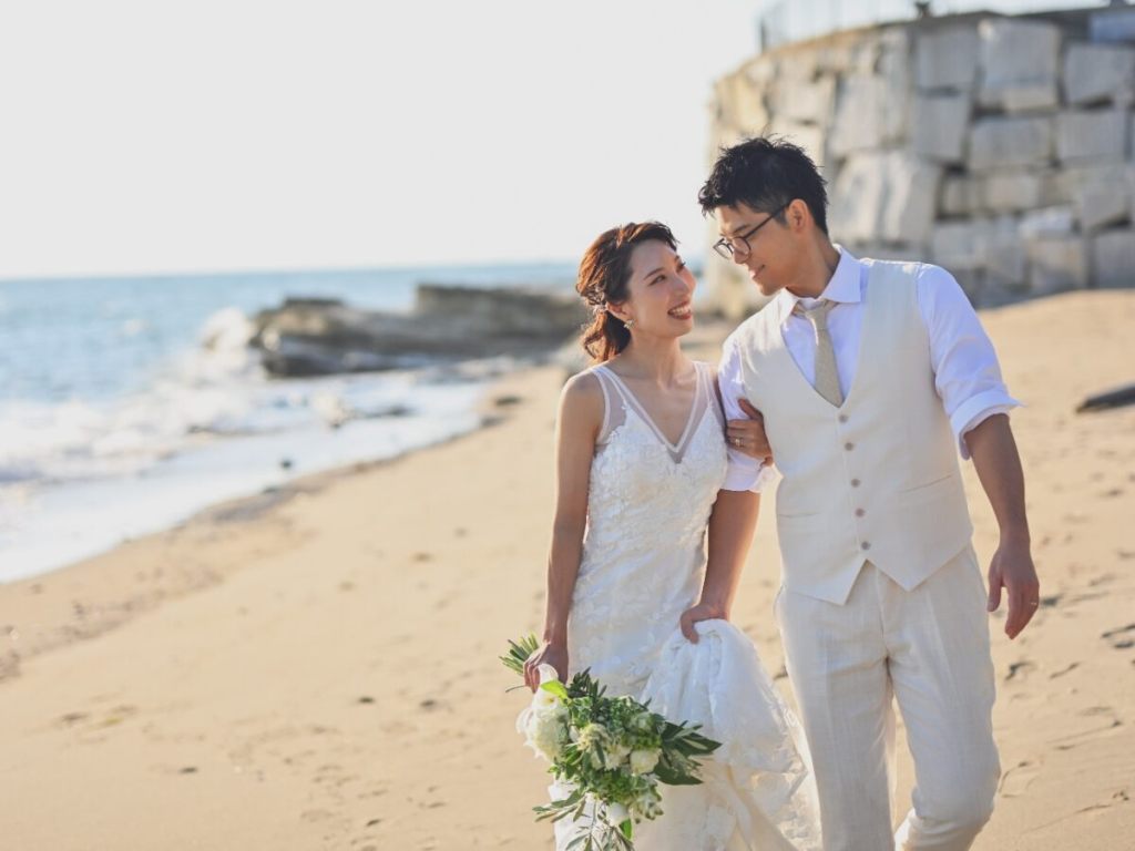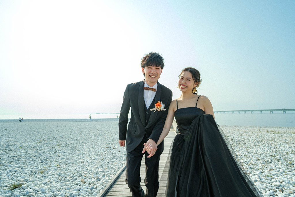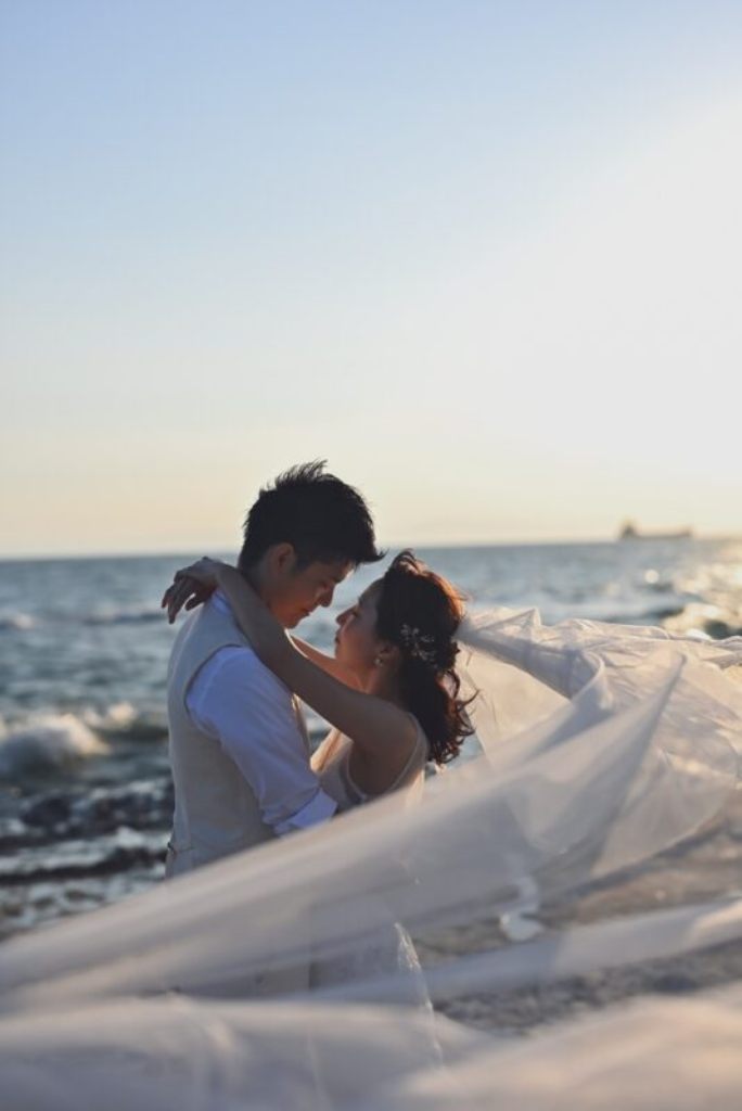 海辺や青空の下で撮影する前撮りにぴったりです。