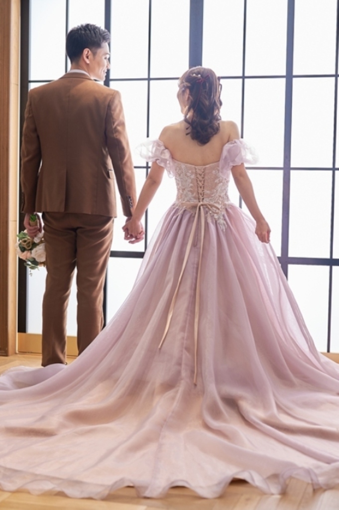 華やかでロマンティックなピンクドレスに、ブラックタキシードを合わせることで、甘すぎずバランスの取れた仕上がりに。