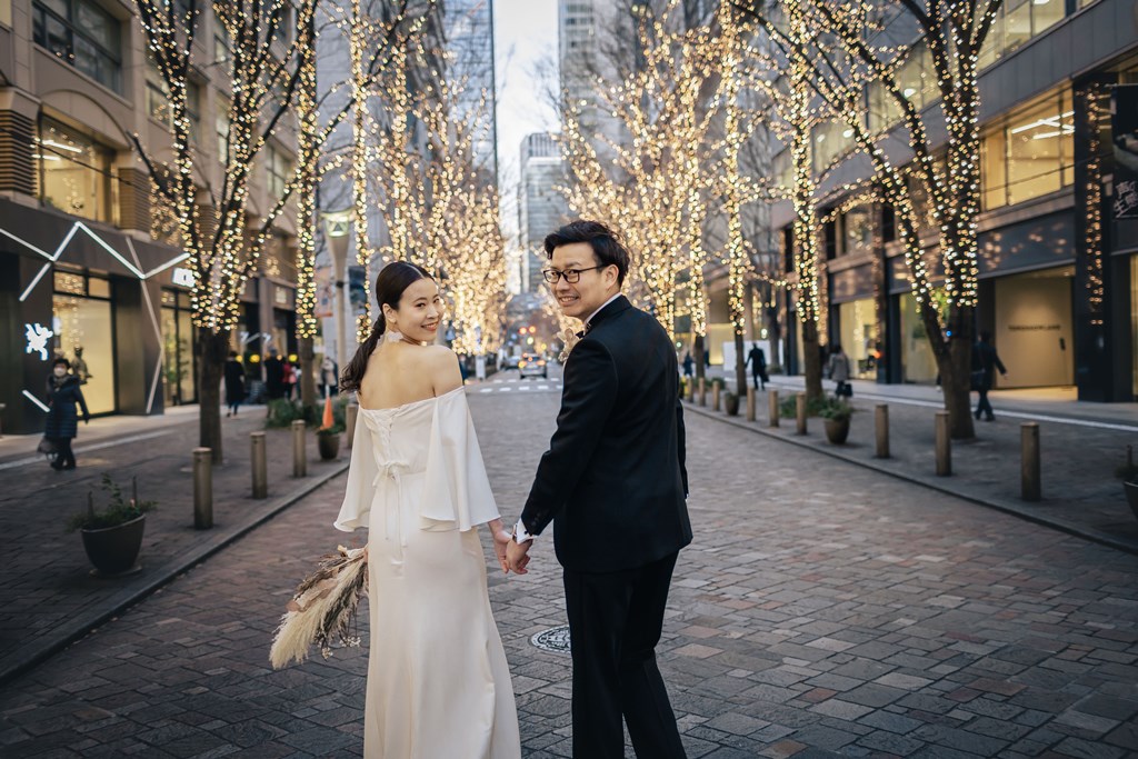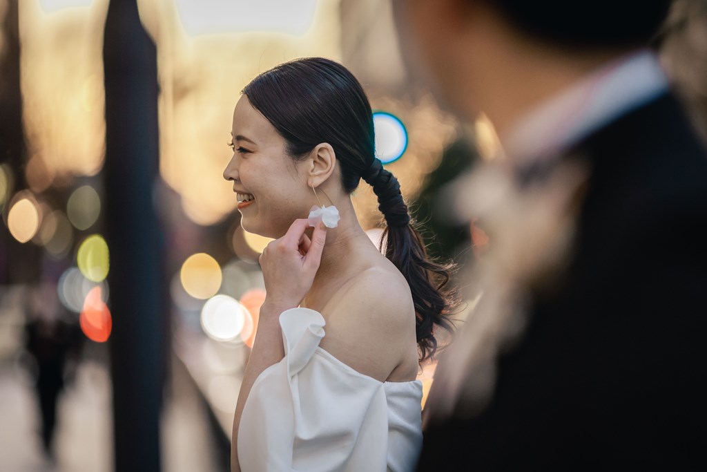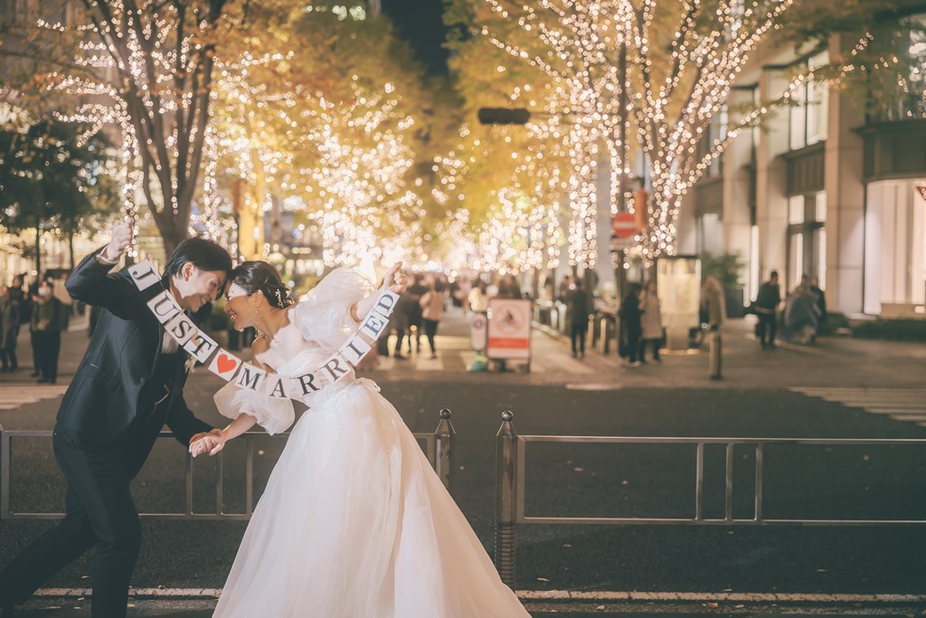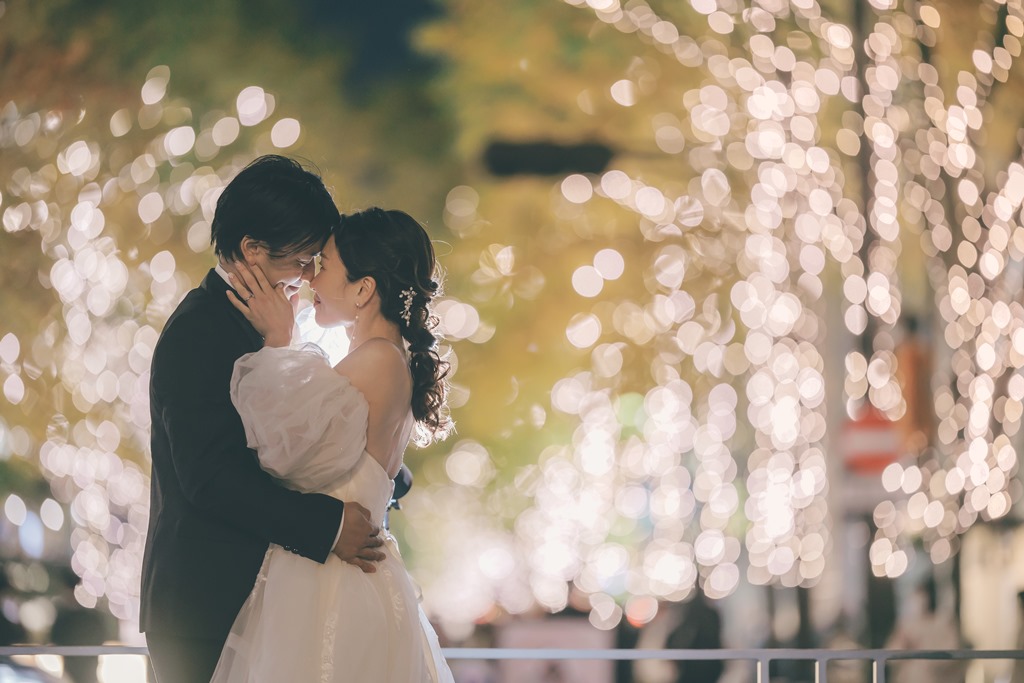 特にイルミネーションを背景にした前撮りは、光の粒がキラキラと映り込み、