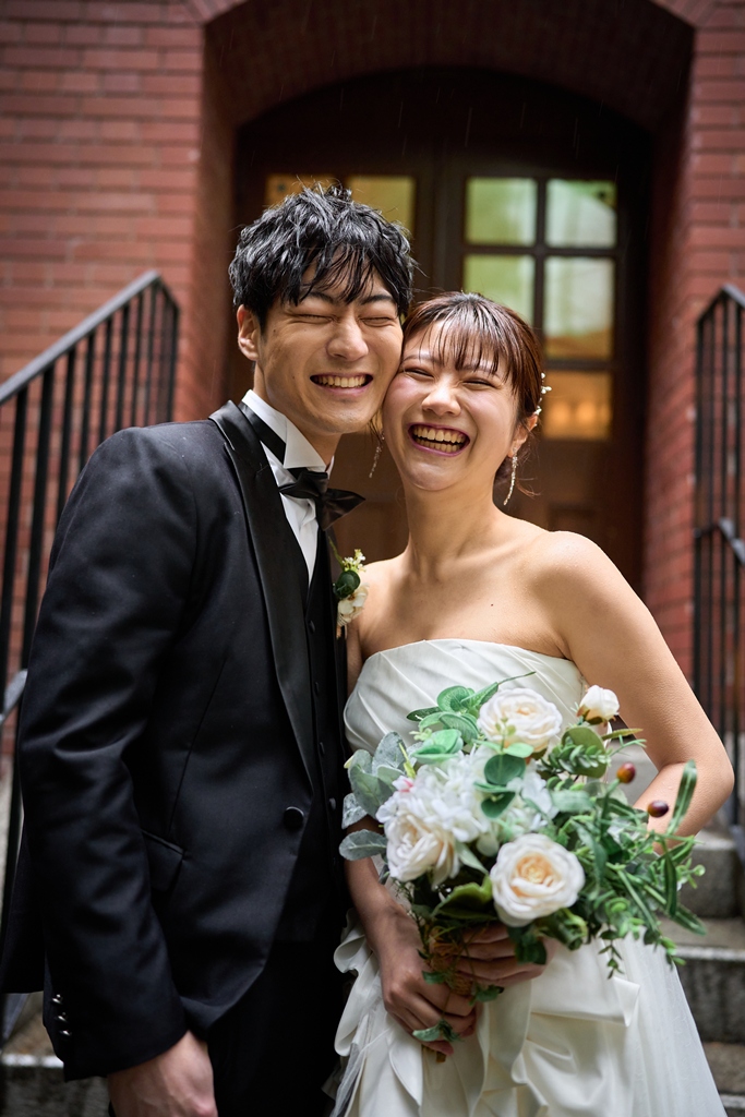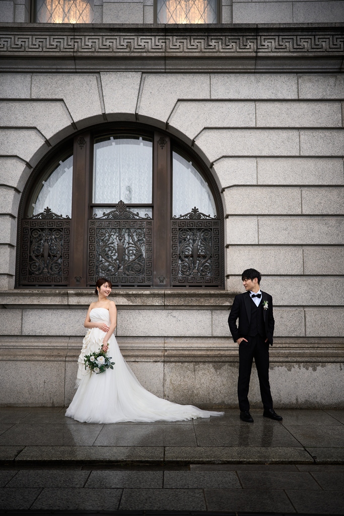 歴史ある東京駅の赤レンガの前で、おふたりが輝くその姿は、まさに”特別”のひと言に尽きます。クラシカルな街並みに映えるドレスとタキシード、そしておふたりの自然な笑顔。