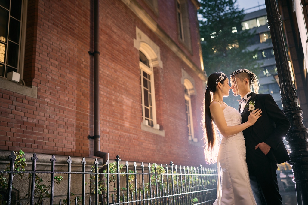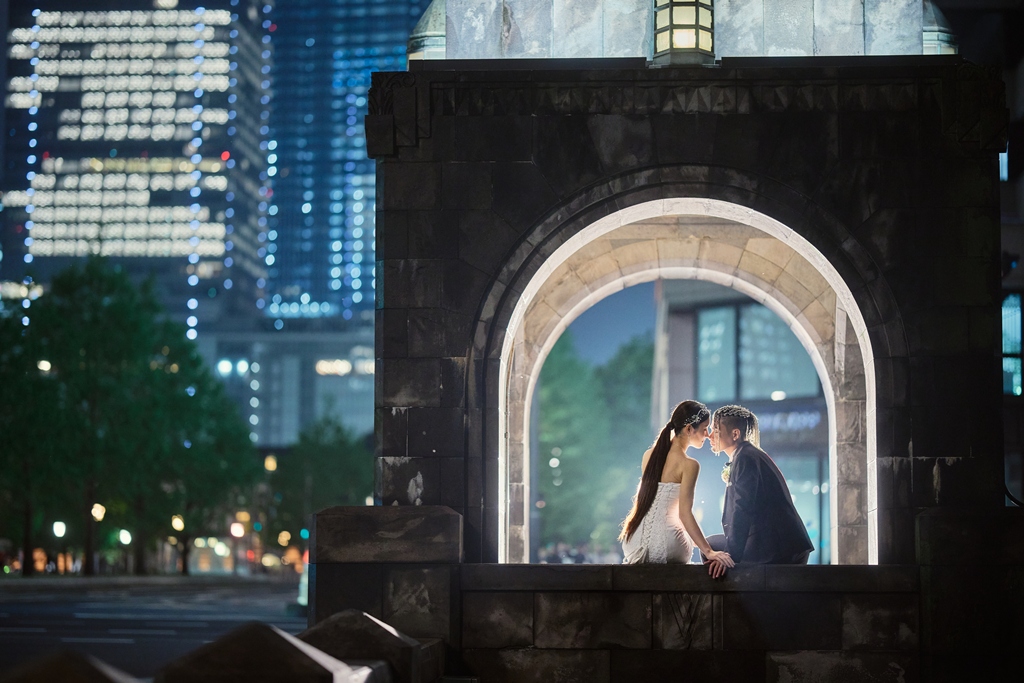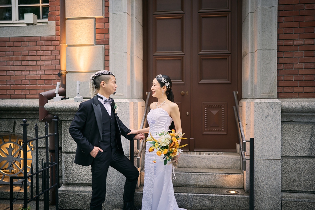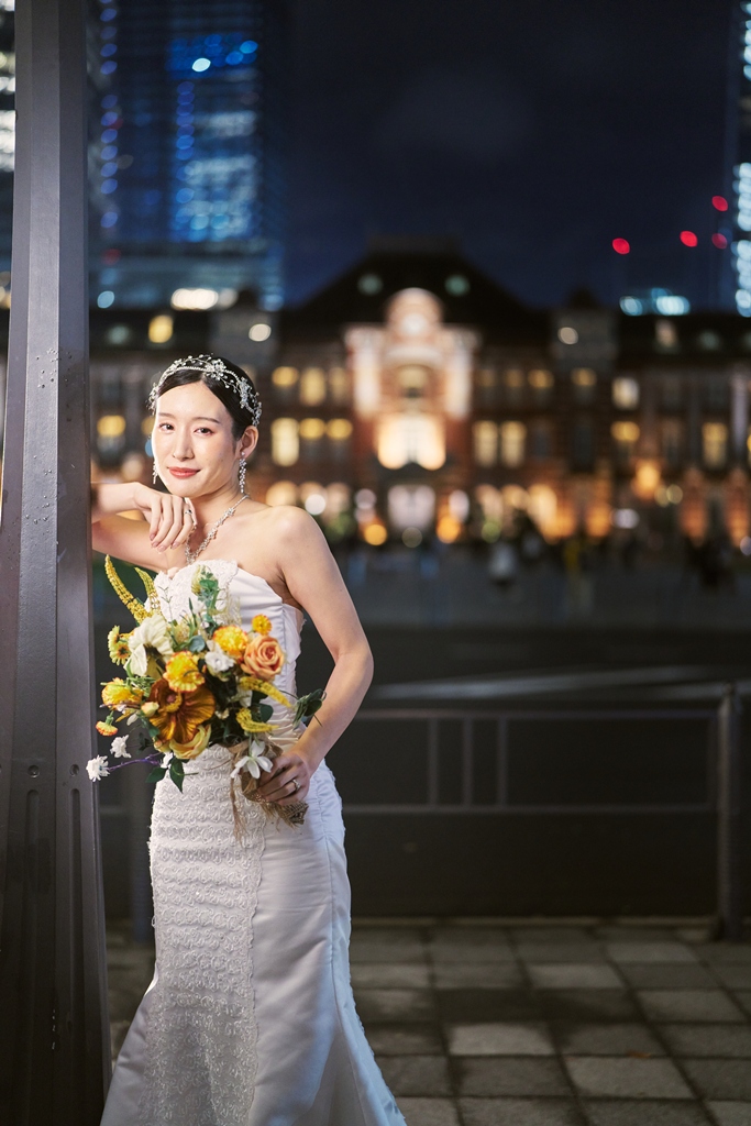 クラシカルな赤レンガと近代的な街並みが共存する東京駅は、まさに「歴史と未来」が交差する特別な場所。そんな空間に、おふたりの洗練された洋装姿が見事に映えていて、シャッターを切るたびに、まるで映画のワンシーンを撮っているような感覚に包まれました。