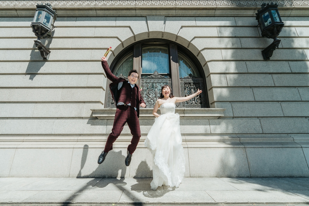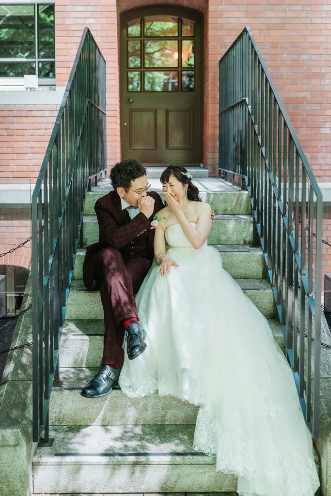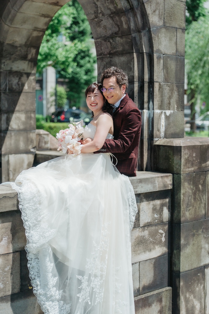 赤レンガの駅舎がそびえるクラシカルな街並みに、おふたりのドレスとタキシードが美しく調和し、まるで映画のワンシーンのような撮影となりました。