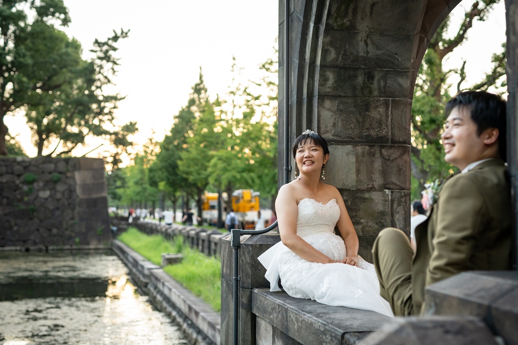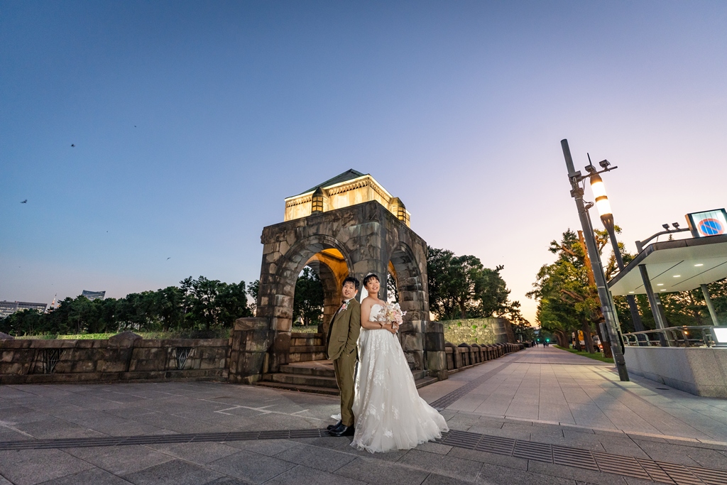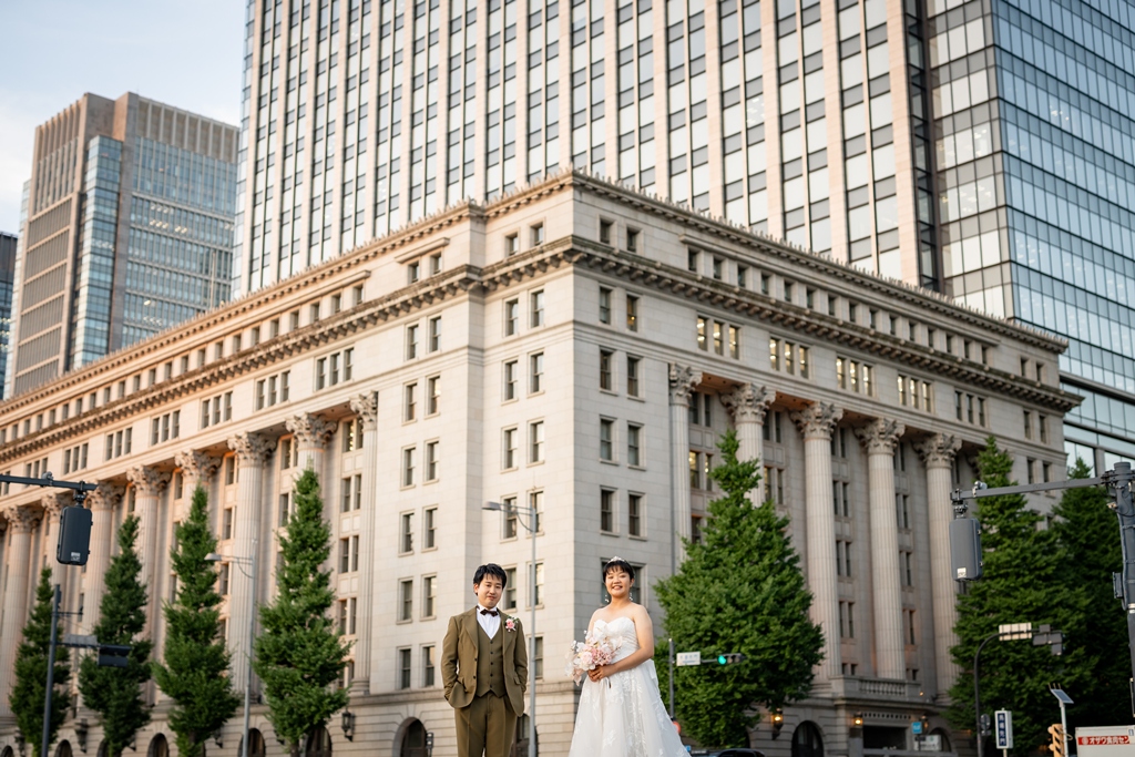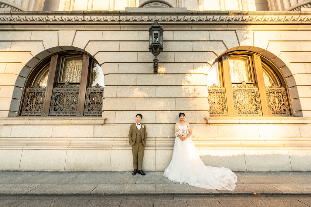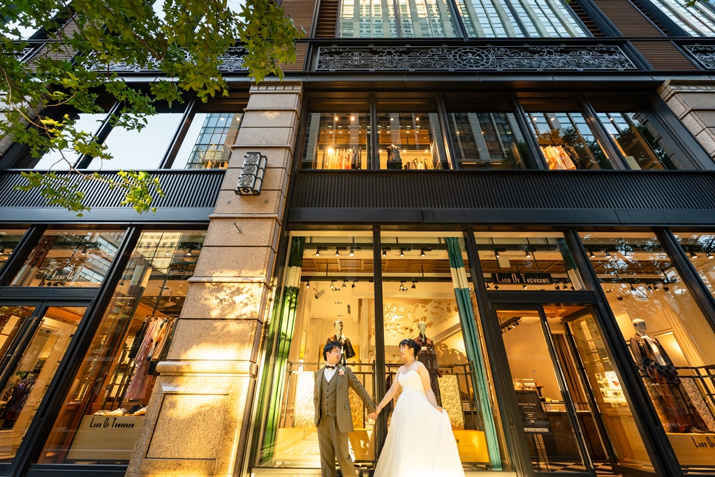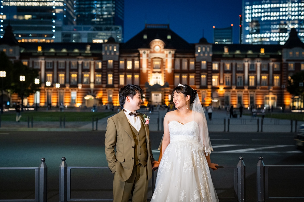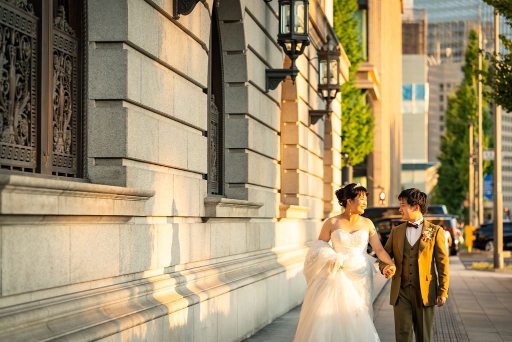 歴史を感じさせる赤レンガ駅舎と洗練された都会の景色が、洋装のお二人をまるで映画の主人公のように引き立ててくれました。
