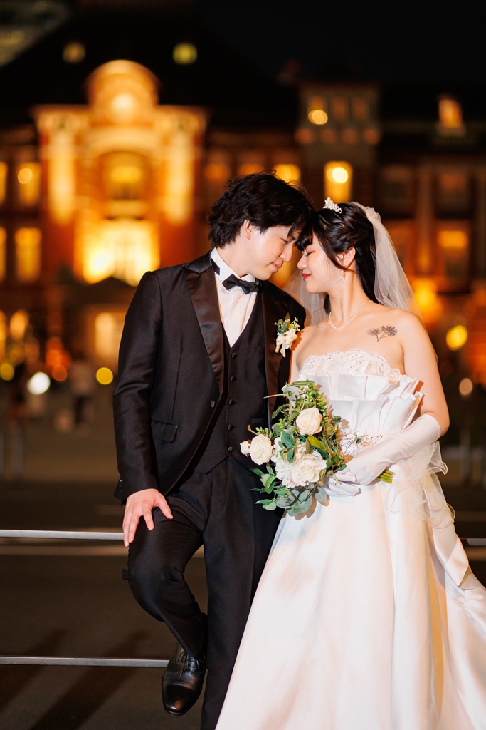 重厚な歴史と気品を感じさせる赤レンガの駅舎、煌めく都会の光に包まれた丸の内の街並み。そのひとつひとつの瞬間が、おふたりの愛の物語をさらに美しく彩っていました。クラシカルな雰囲気と都会的な洗練さを兼ね備えたこのロケーションは、まさにおふたりの上品さと調和し、誰もが振り返るほどの輝きを放っていましたね。