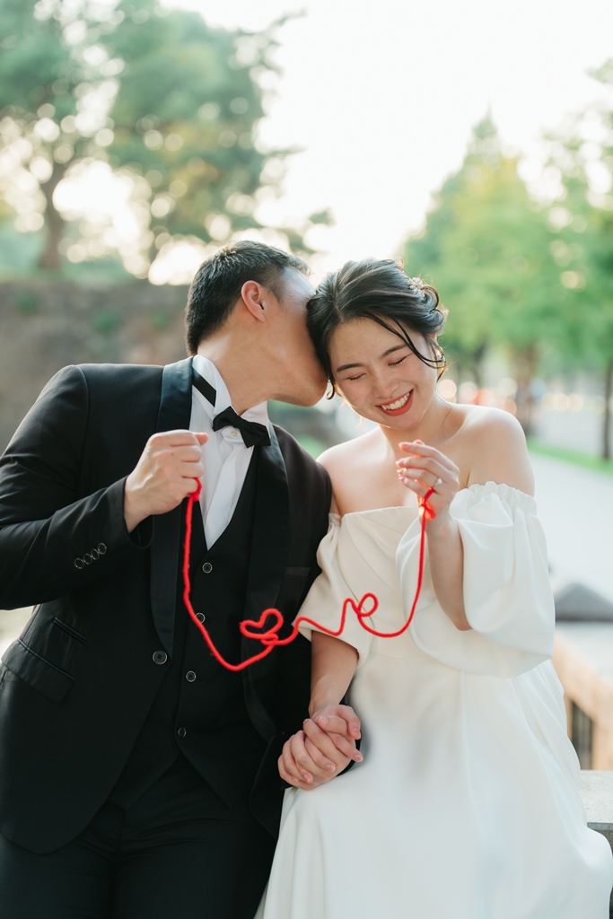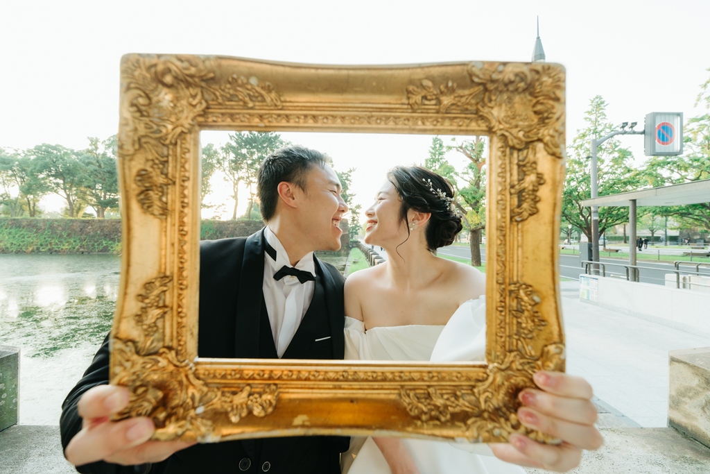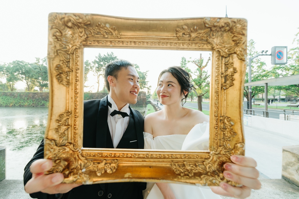 装いの優雅さと自然な表情が重なり、ただの写真ではなく、一生の宝物となる作品が生まれました。この特別な場所で過ごした一日が、いつまでもお二人の心に温かく、楽しい思い出として残りますように。