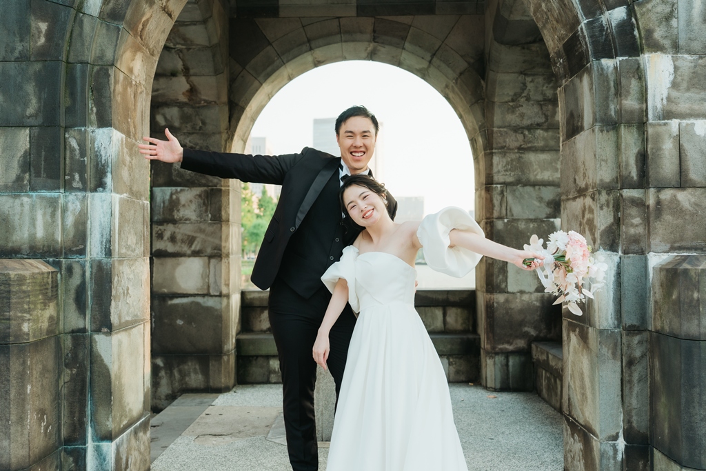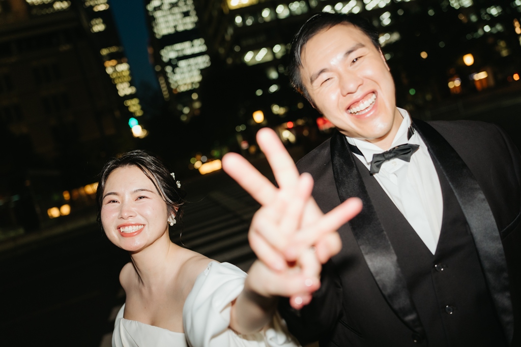 壮大な建物とお二人の洗練された装いが融合することで、まるで映画のワンシーンのような一枚一枚が生まれ、この日のロマンスと街の活気を見事に捉えることができました。