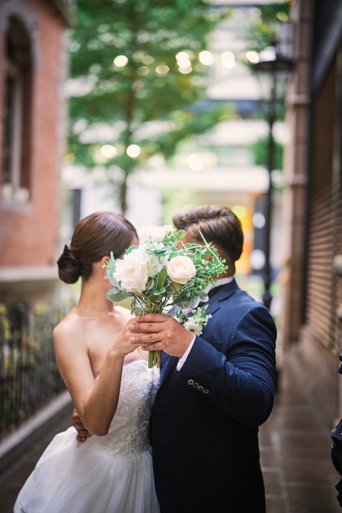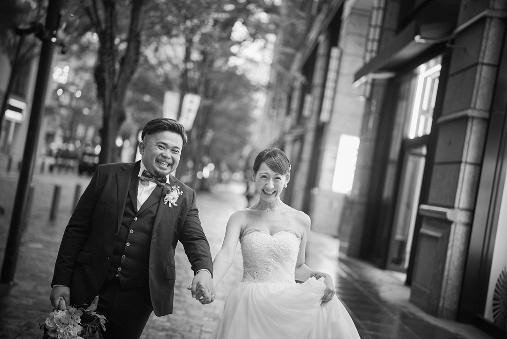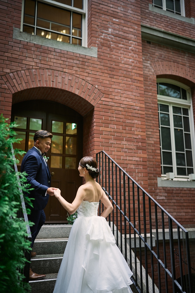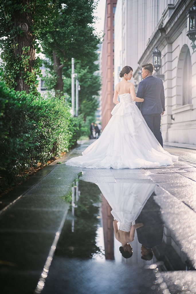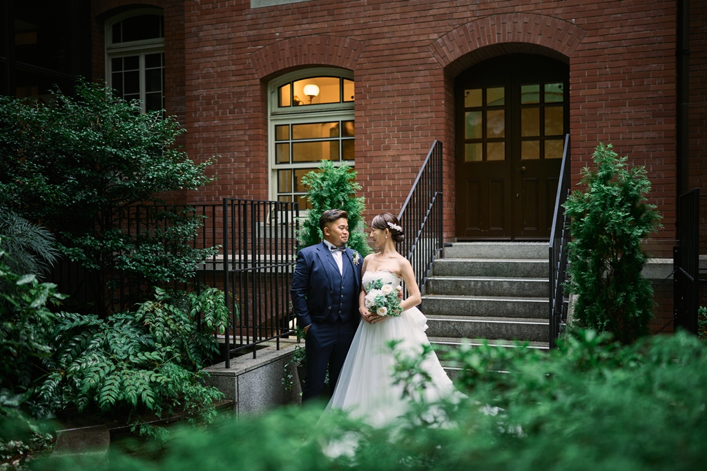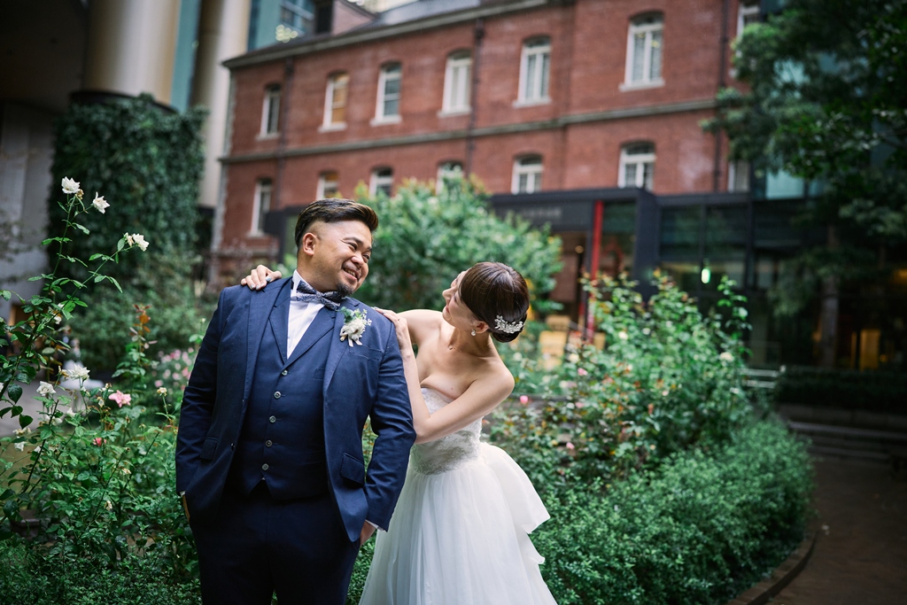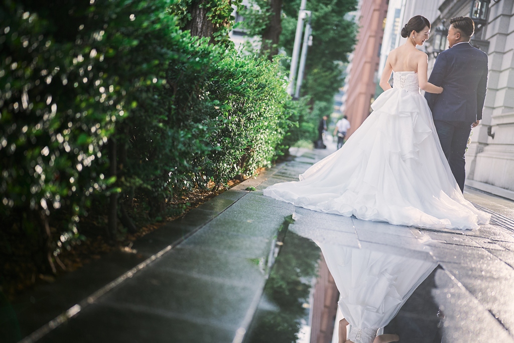 赤煉瓦の重厚さ、柔らかな光、行き交う空気の緊張感と華やぎが同居するこの場所は、まさに洋装が最も輝く舞台のひとつです。撮影当日、ドレスとタキシードをまとったおふたりが東京駅前に立たれる姿は、まるで雑誌の表紙のように美しく、スタッフ一同、胸が熱くなる思いで見守っておりました。