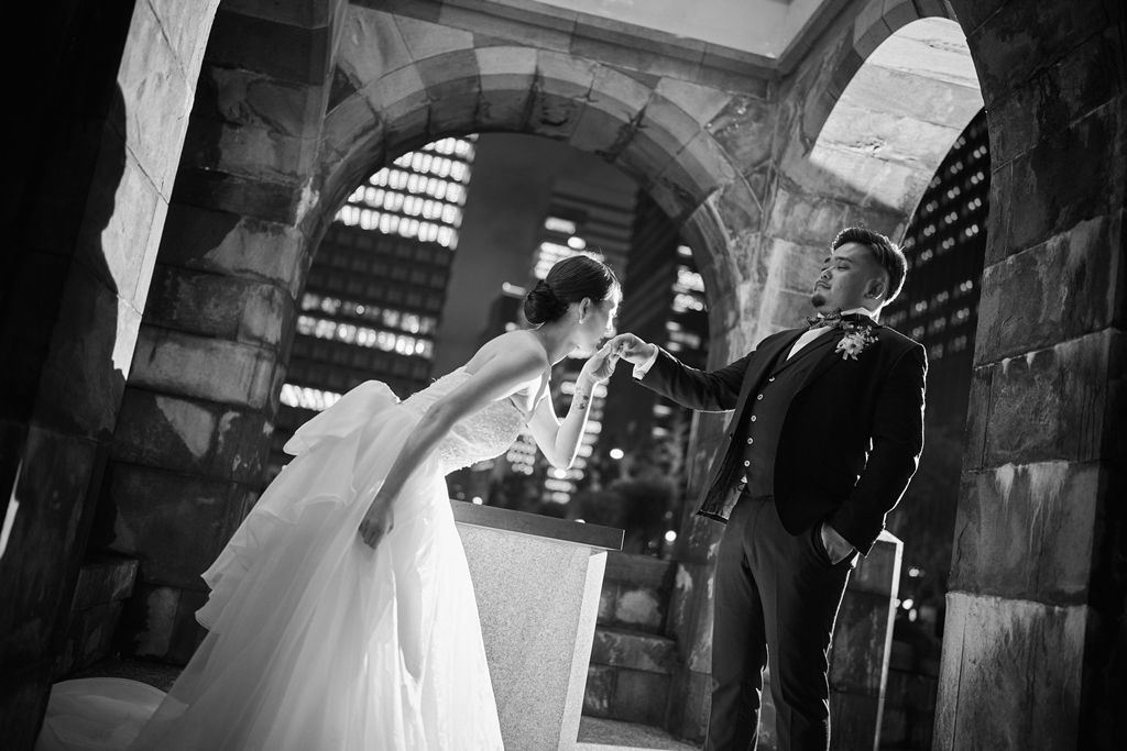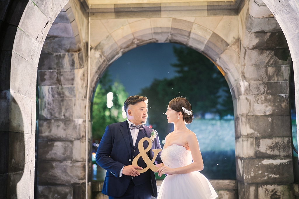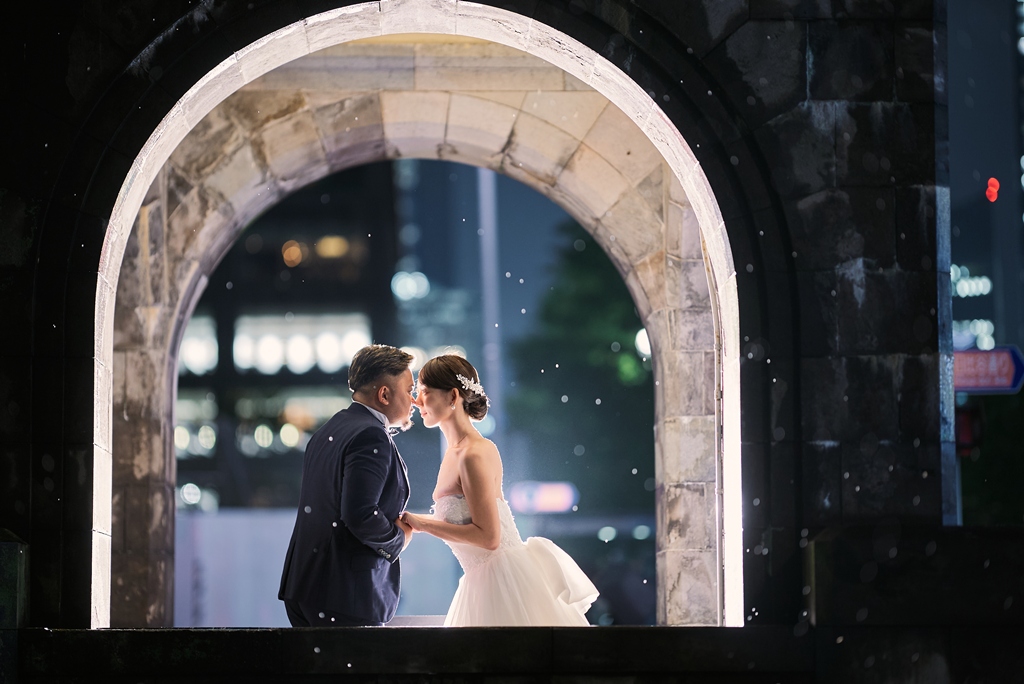 駅舎のライトに照らされた瞬間や、周囲の光がシルエットを包む瞬間、ふと視線を合わせて微笑む瞬間など、ひとつひとつのシーンが特別であり、心に残るものでした。日中は明るく壮麗な雰囲気が広がり、夕方にかけては光の色が柔らかく変わり、夜に近づくと街の灯りが背景を優しく彩り、おふたりの姿をより際立たせておりました。