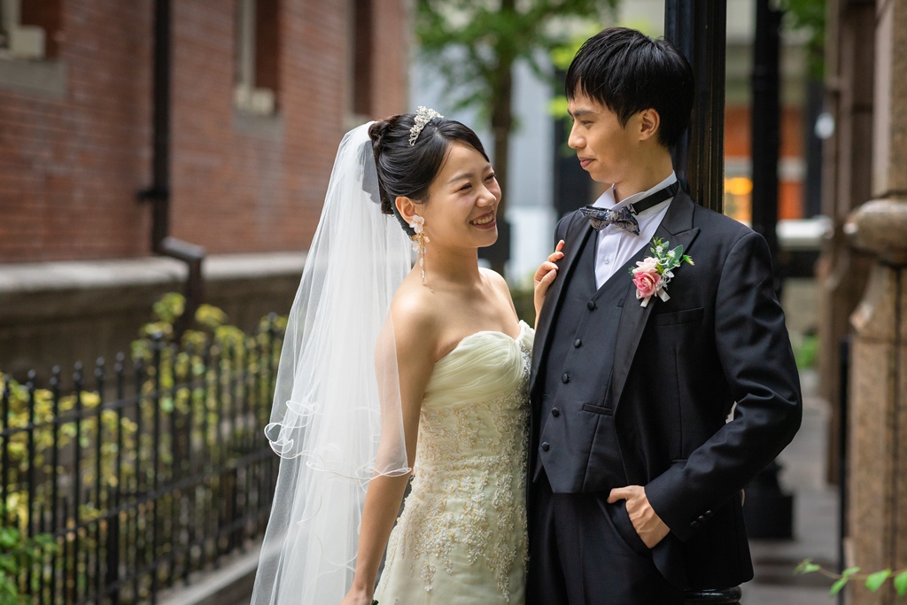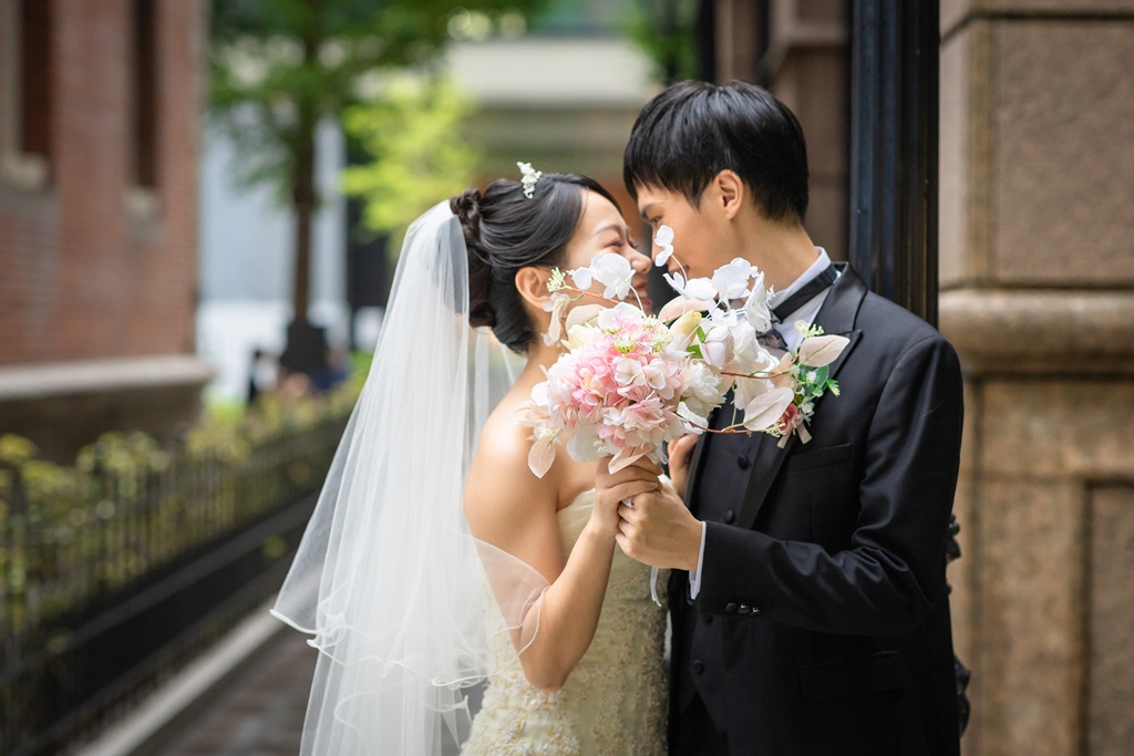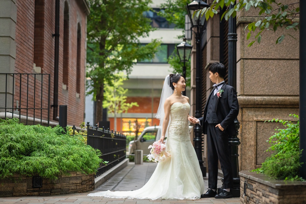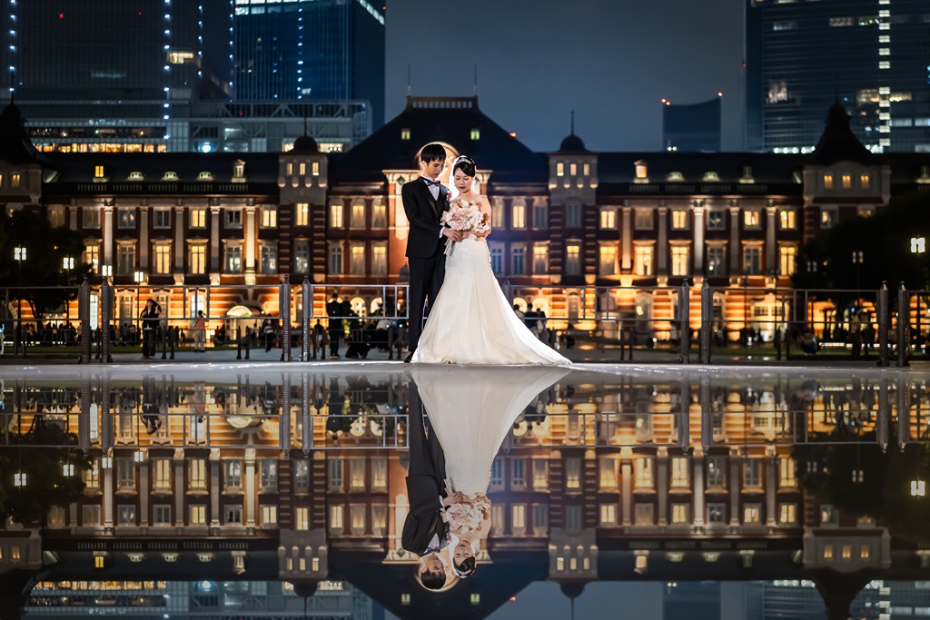 最初はWebでお店の雰囲気を拝見し、とても良さそうだと感じ興味を持ちました。その後、実際に店舗へ相談に伺った際に目にした写真がどれも本当に綺麗で、スタッフの方の対応も丁寧だったので、このお店なら安心して撮影をお願いできると思い、決めたのがきっかけです。 東京駅前は、歴史ある赤レンガの駅舎と近代的なビルが調和する特別な場所で、昼と夜でまったく違う雰囲気を楽しめるのが魅力です。結婚の記念写真には、都会的でありながら上品さや格式も感じられる点に惹かれました。