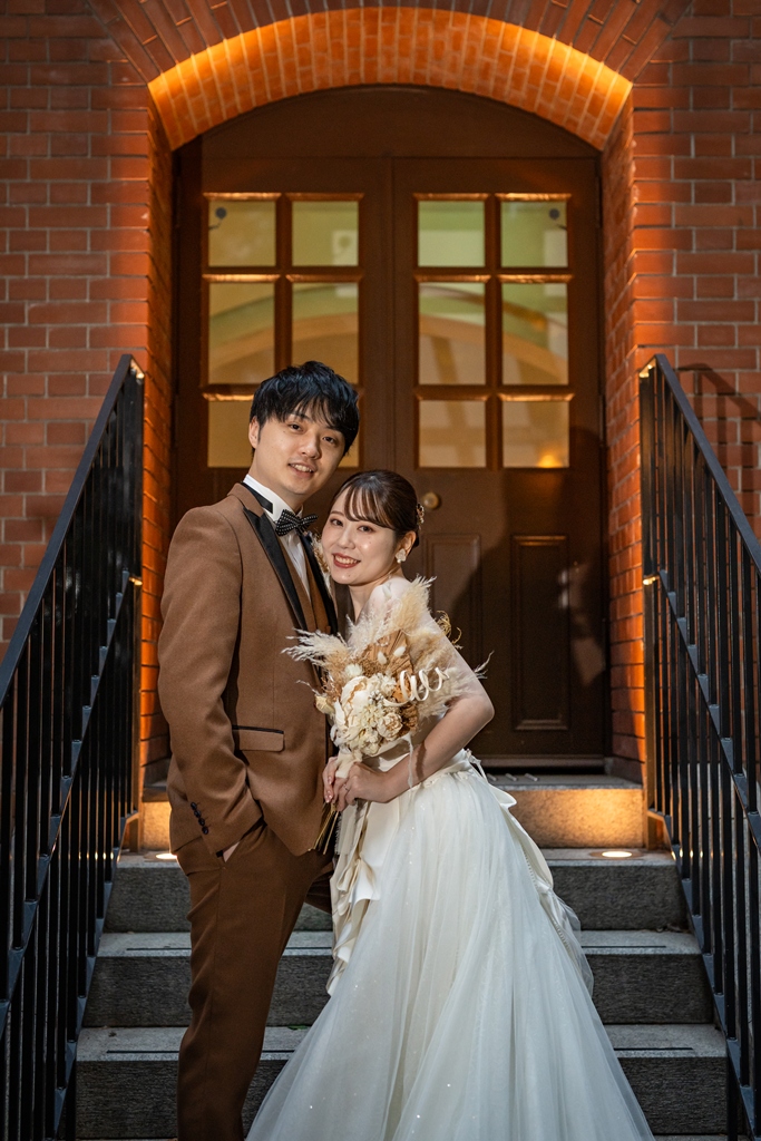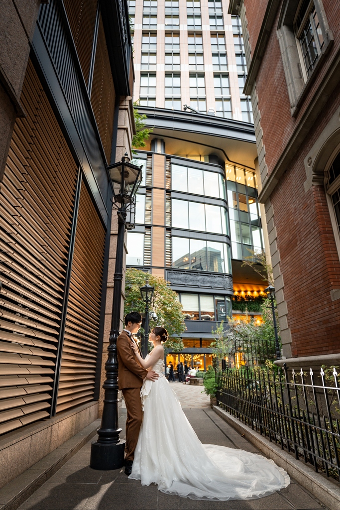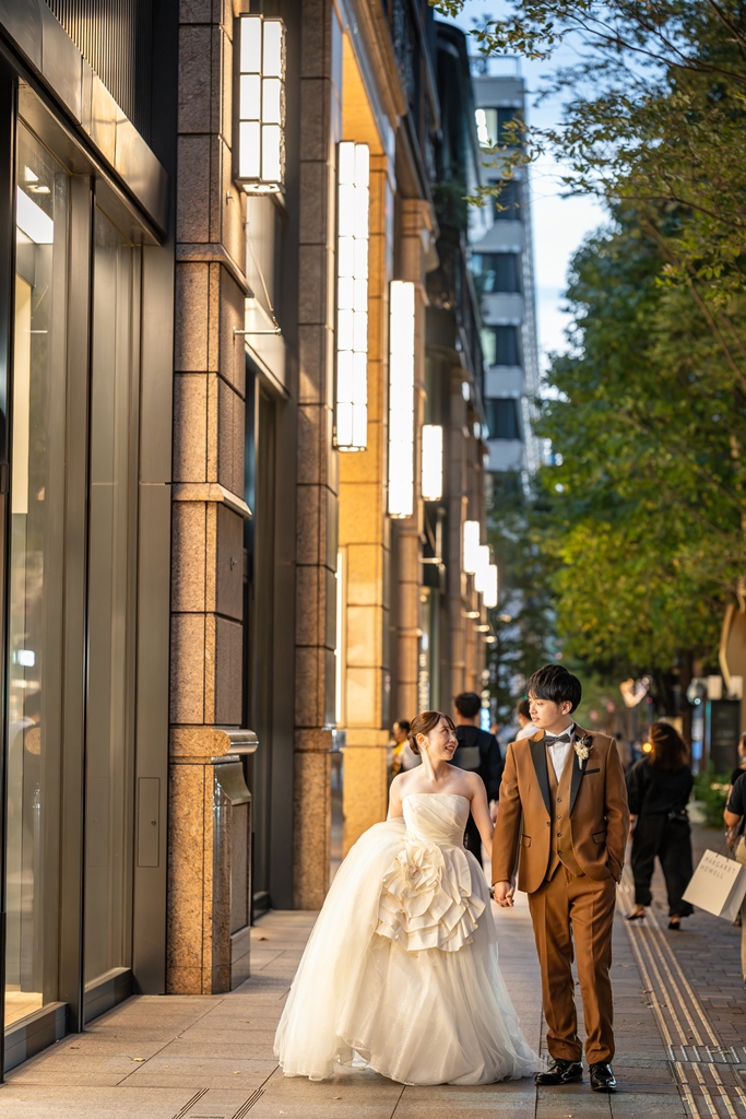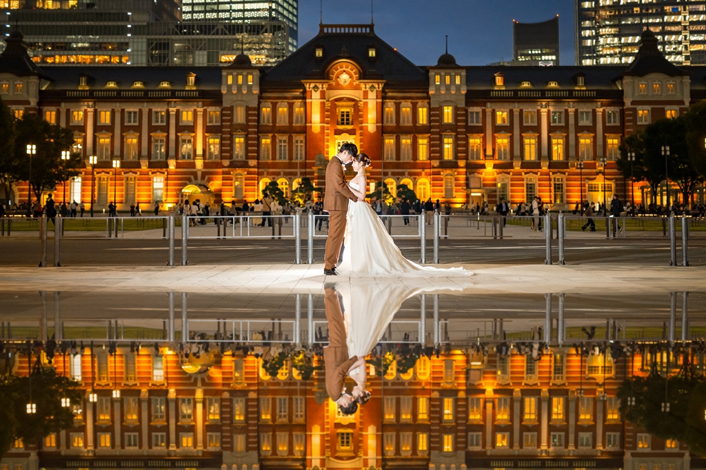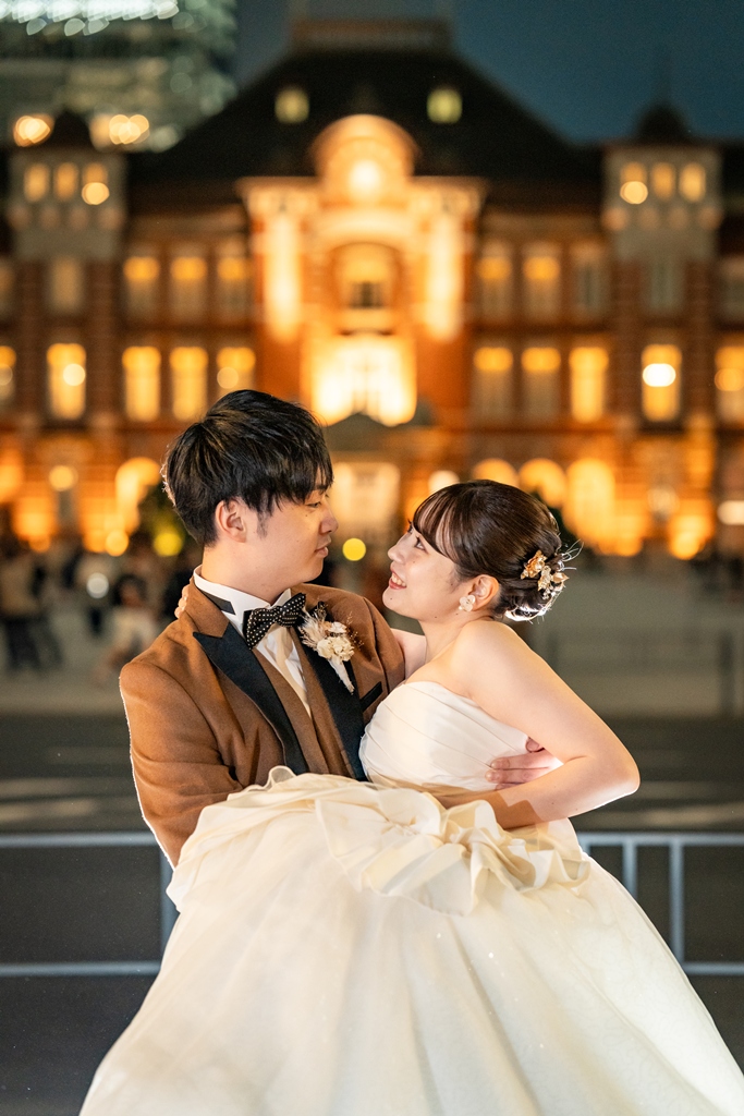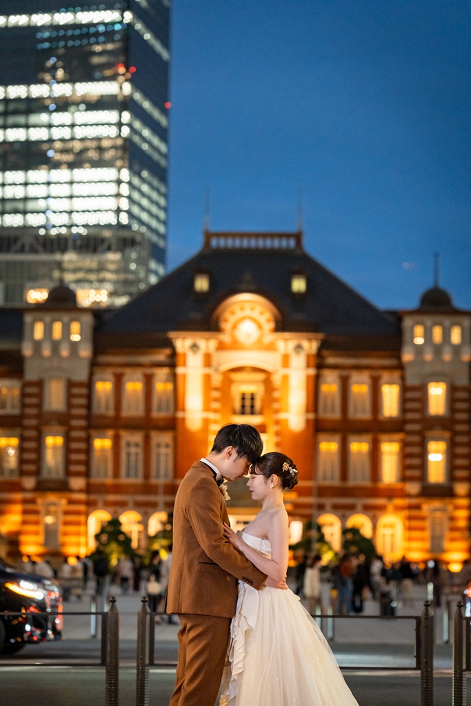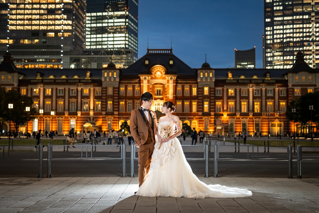 おふたりが手を取り合いながら駅舎の前を歩む姿は、この街の壮大さと気品のあるウェディングスタイルが見事に調和し、まるで映画の主人公のように輝いておりました。夕暮れの柔らかな光に包まれる時間帯も、夜景が灯り始めるロマンチックな瞬間も、どのシーンを切り取っても、そこにはおふたりだけの“特別な物語”がありました。