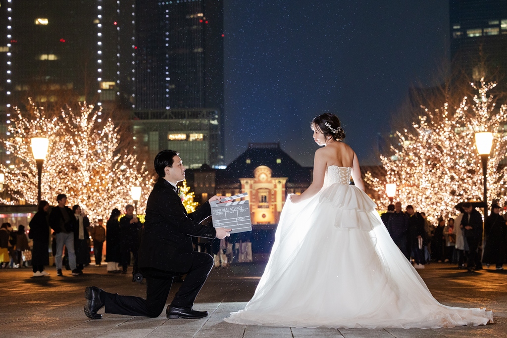 駅舎前で新郎新婦がプロポーズしているような素敵なワンシーンの写真に出会いました。