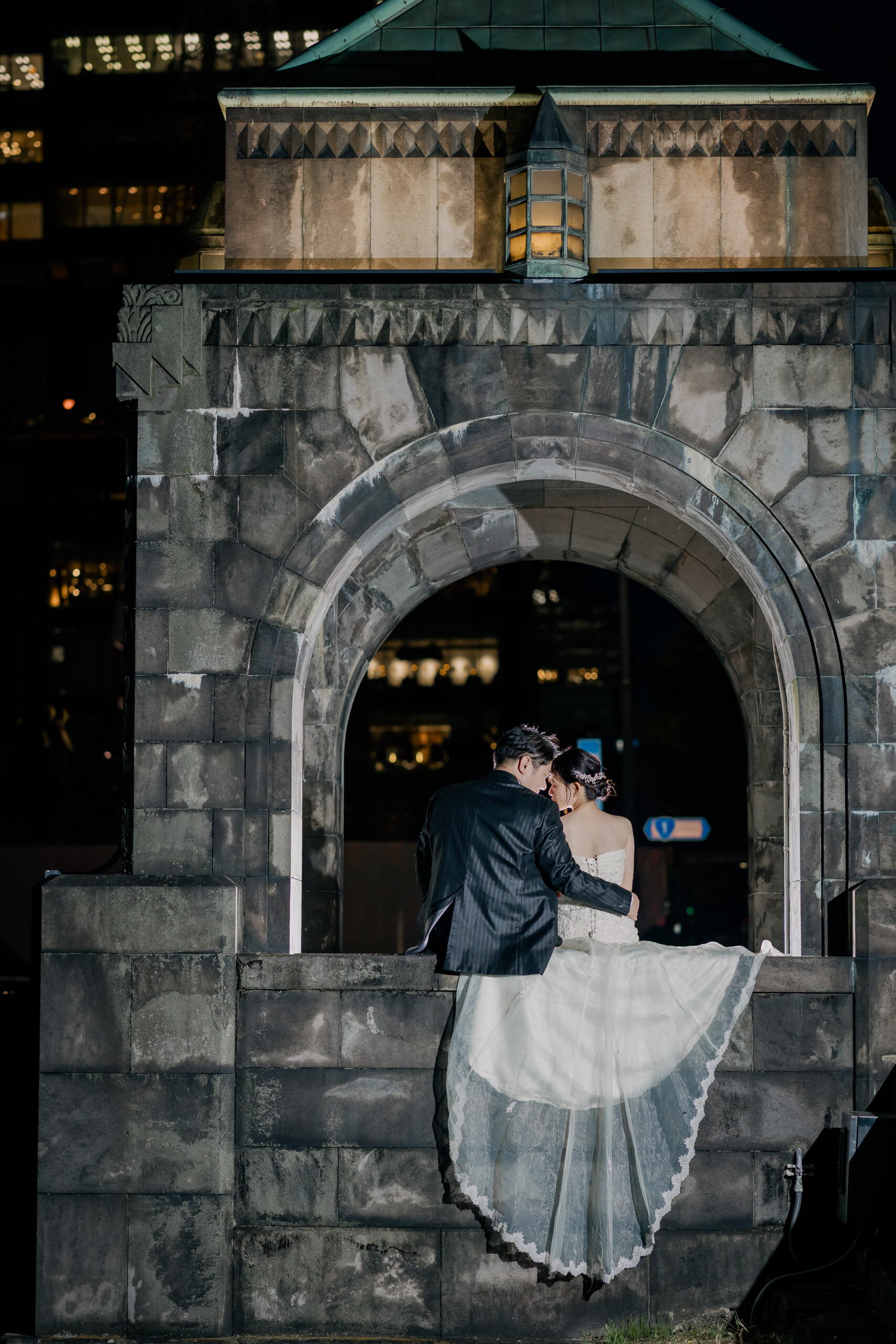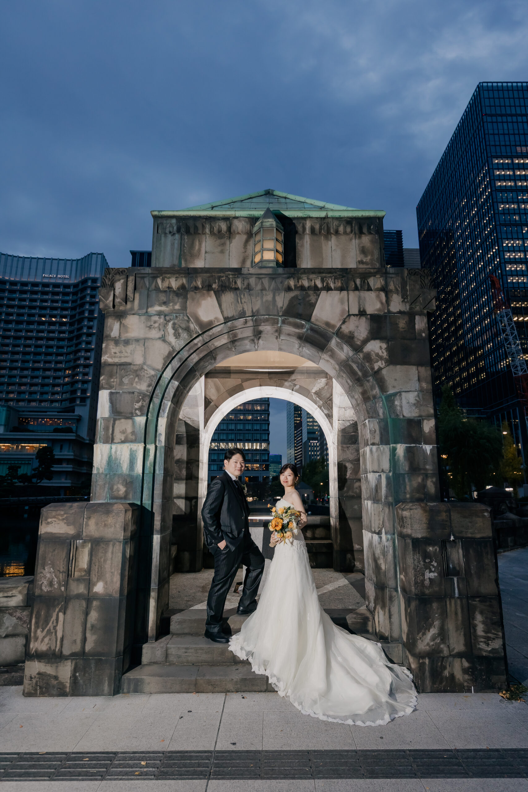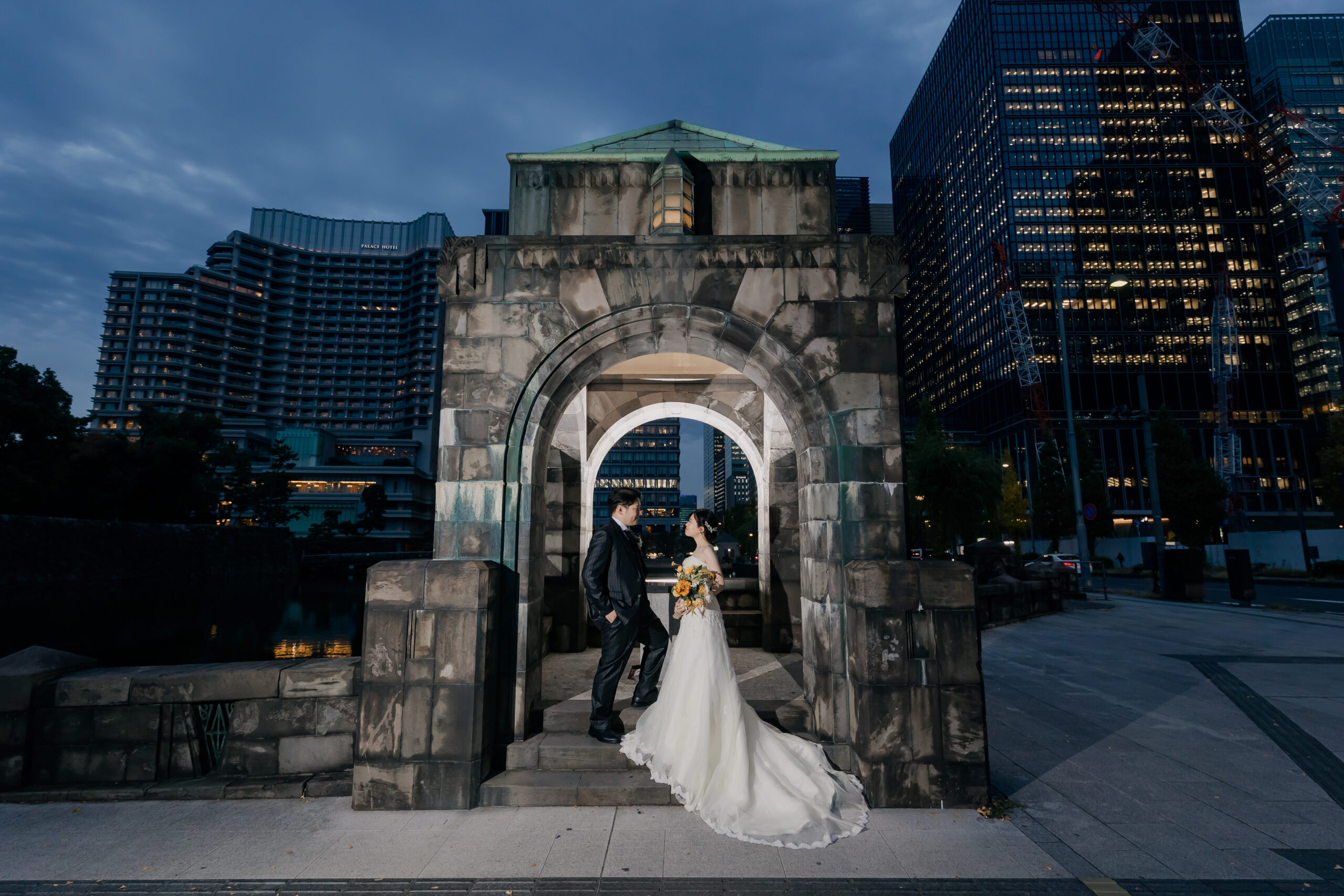 夕方のやわらかな光から、夜へと移り変わる時間帯の撮影は、和田倉門の落ち着いた雰囲気や、ライトアップされた東京駅の美しさがより印象的で、おふたりの洋装姿が街の景色に自然と溶け込んでいました。