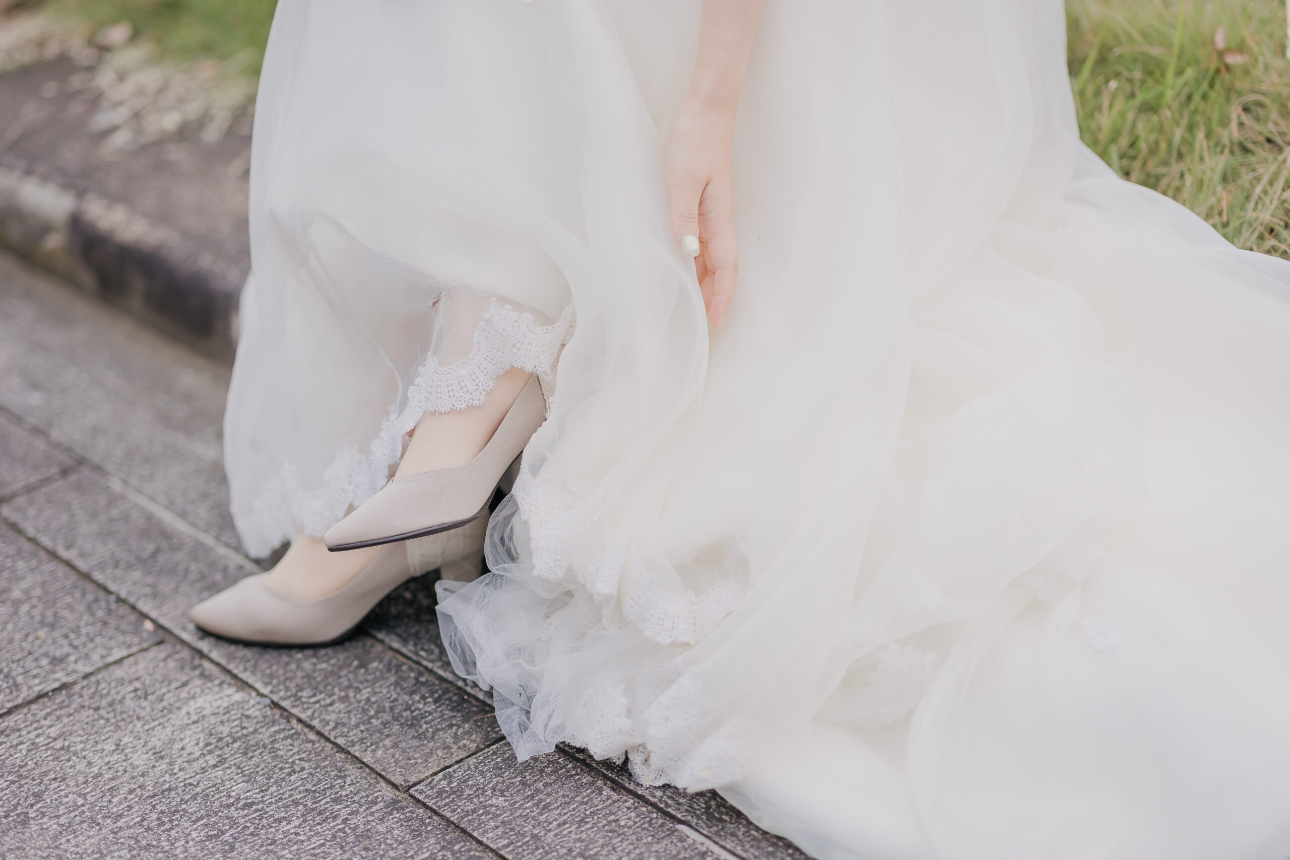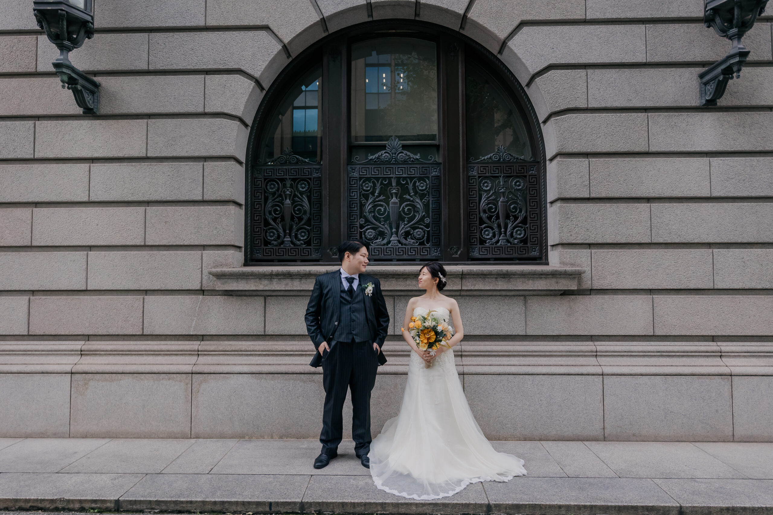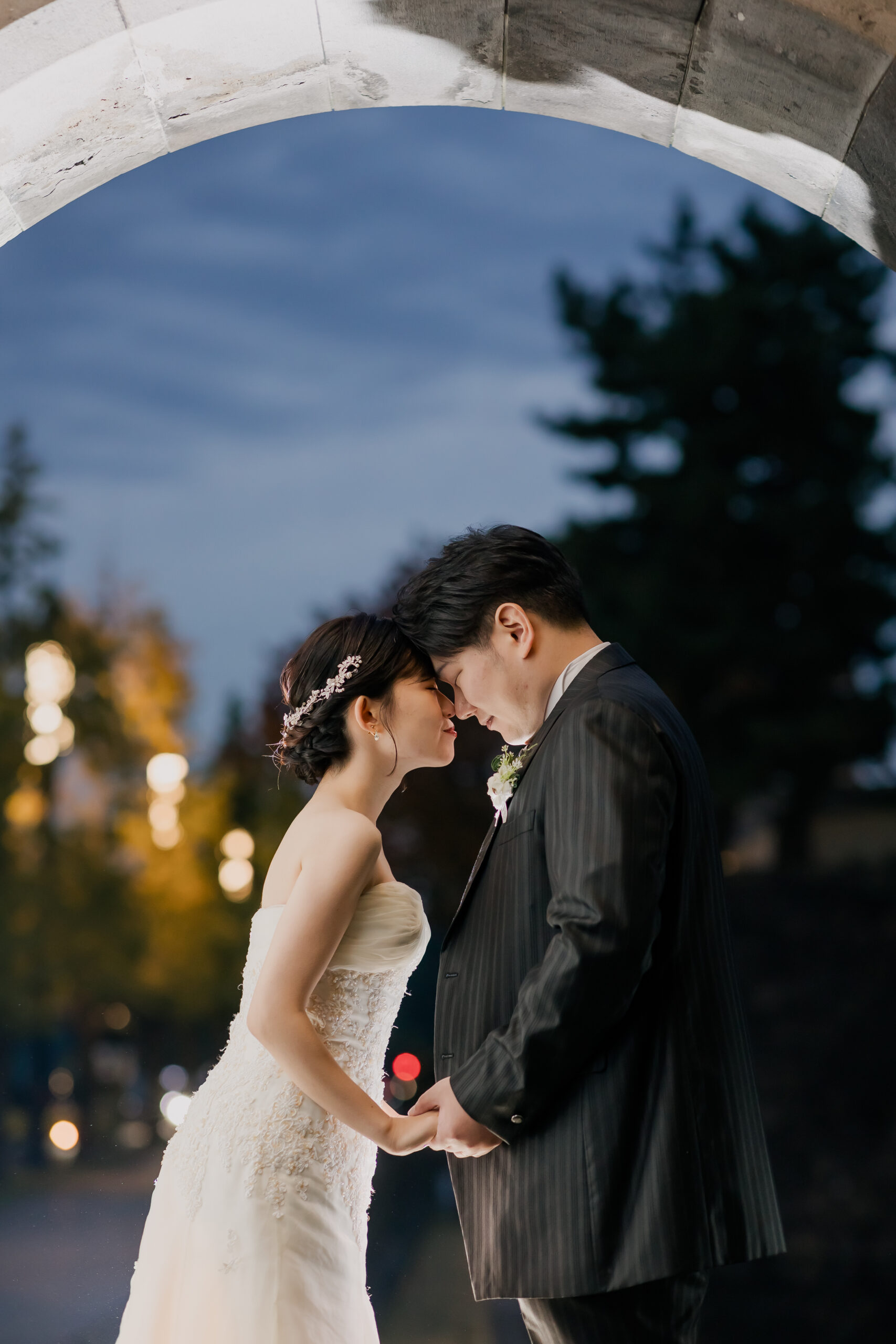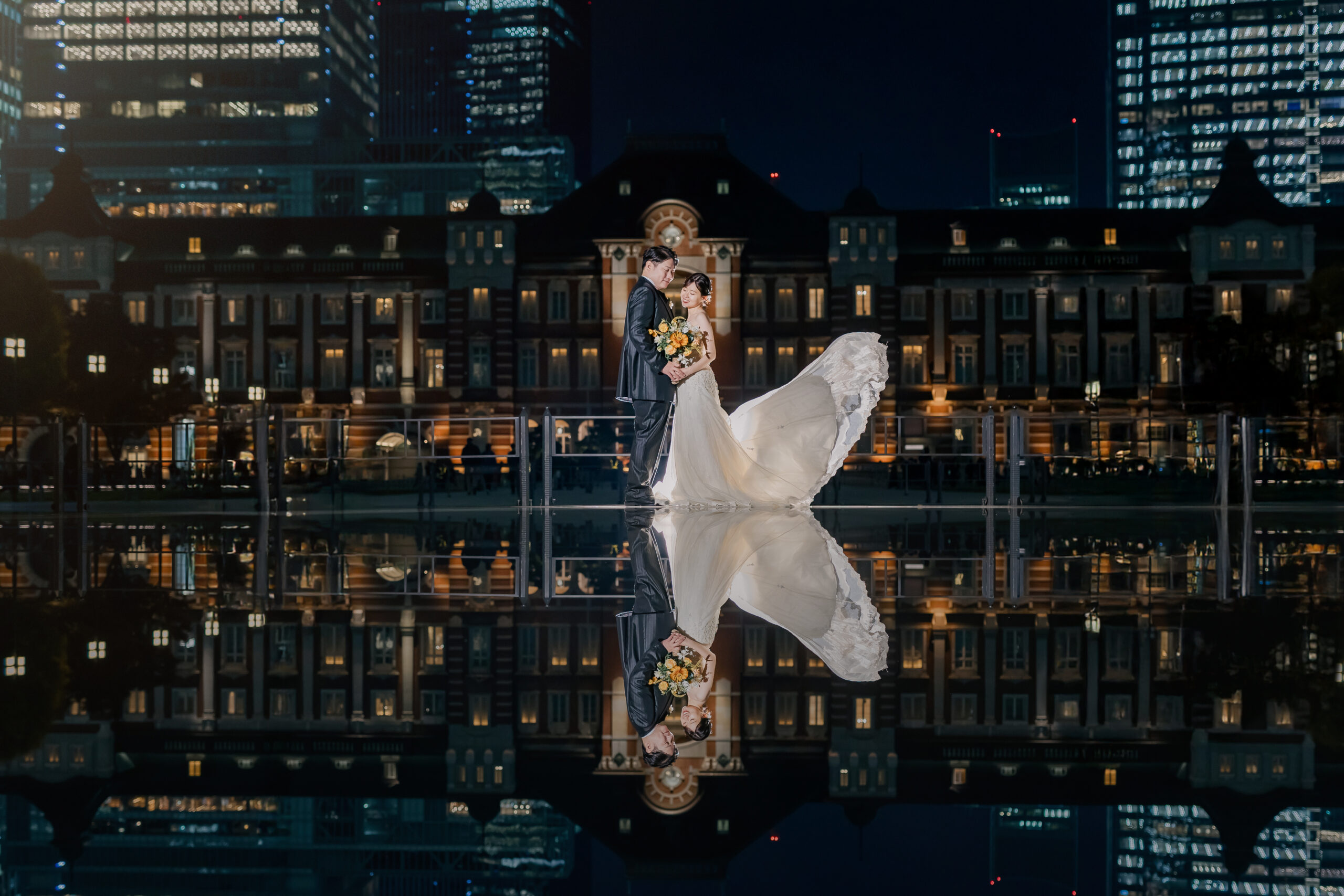 夕方のやわらかな光から、夜へと移り変わる時間帯の撮影は、和田倉門の落ち着いた雰囲気や、ライトアップされた東京駅の美しさがより印象的で、おふたりの洋装姿が街の景色に自然と溶け込んでいました。